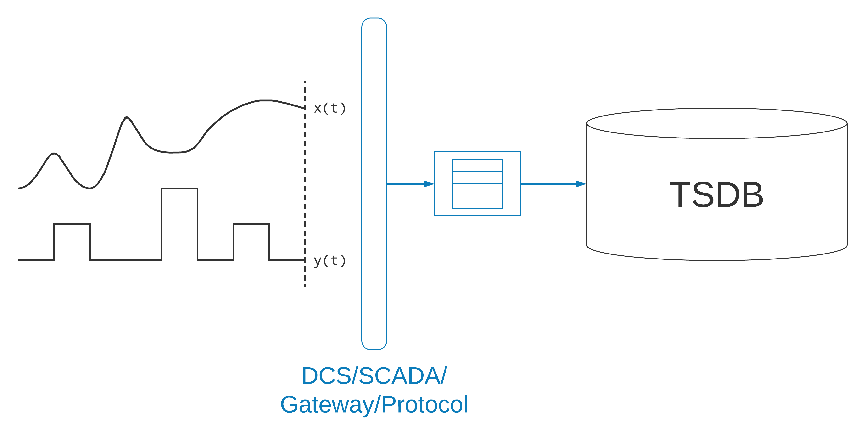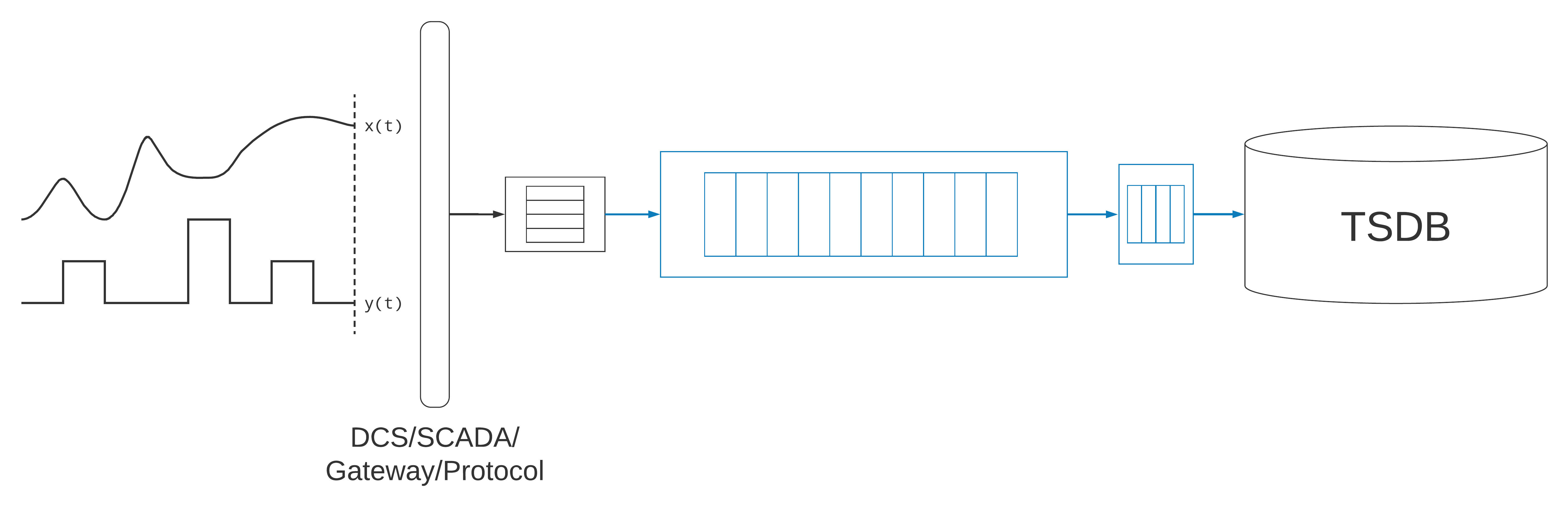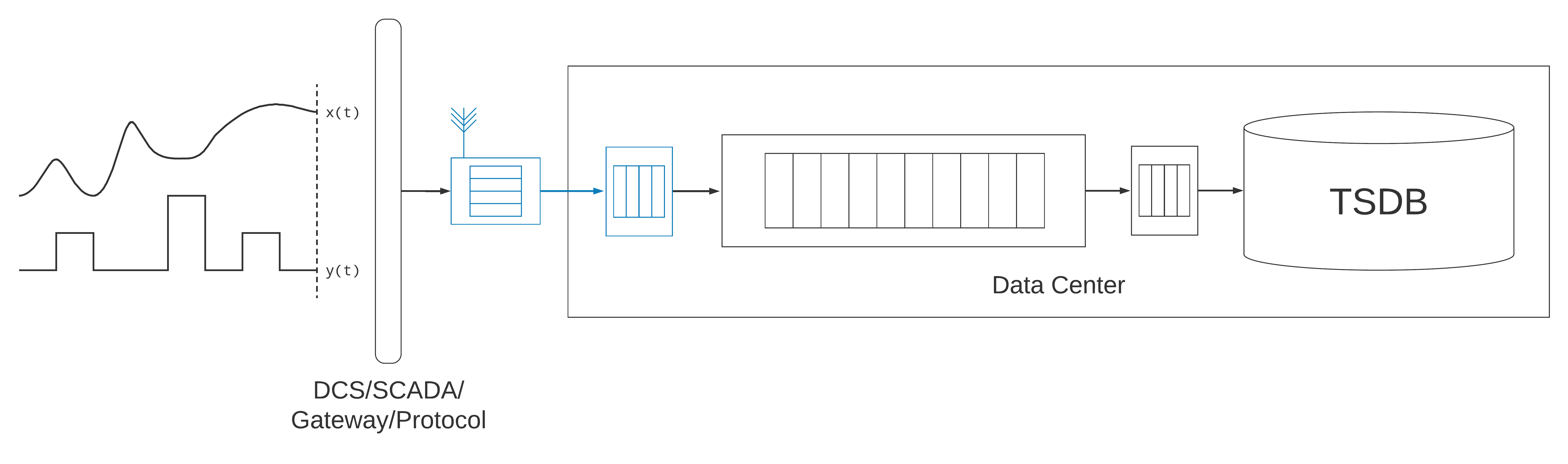 In an industrial setting, rarely is the data collection agent sampling the process directly. It is usually communicating with an intermediary—a sensor, a gateway, a supervisory control and data acquisition (SCADA) system, or a distributed control system (DCS). It might use a custom protocol, or a standard protocol like Modbus, DNP3, OPC, or MQTT. The process collecting the data can usually sustain a very large, durable queue of samples, perhaps for days, so that data collection will be complete in the event of a network partition to the time-series database. In terms of networking, this application will be located very close to the process; in some cases, it will have a direct physical connection. The data collection agent may also be redundant, to provide high-availability in the event of a failure.