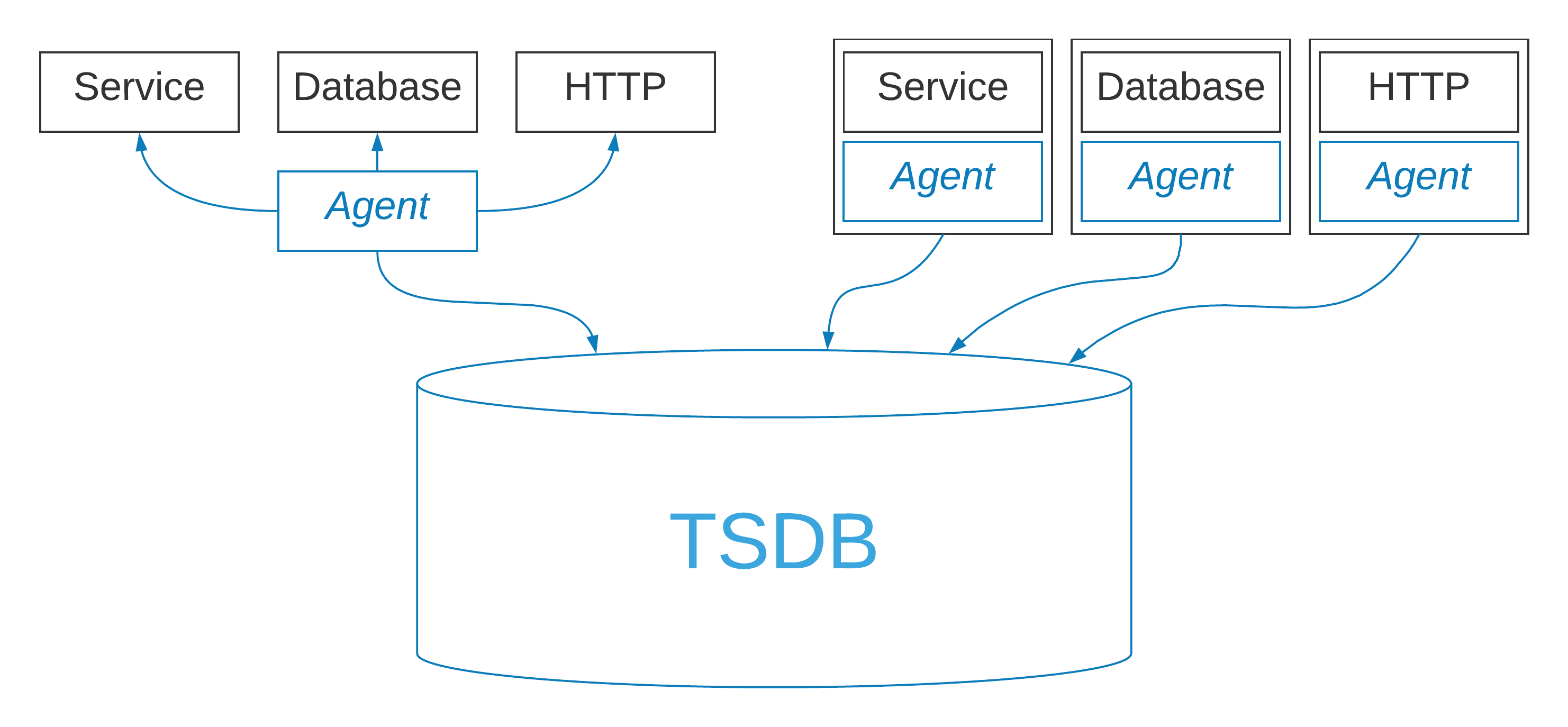 In the data center, service metrics are usually sampled directly from the service itself. One approach is to have a central agent that polls various endpoints and writes the samples to the time-series database. Another approach is to deploy a sidecar container along with the service. The sidecar approach is easy to manage and it makes application metrics immediately available as part of the deployment. Compared to a centralized metrics collection approach, the sidecar can also buffer samples in the event of a network partition or database maintenance, ensuring that there is no data-loss.