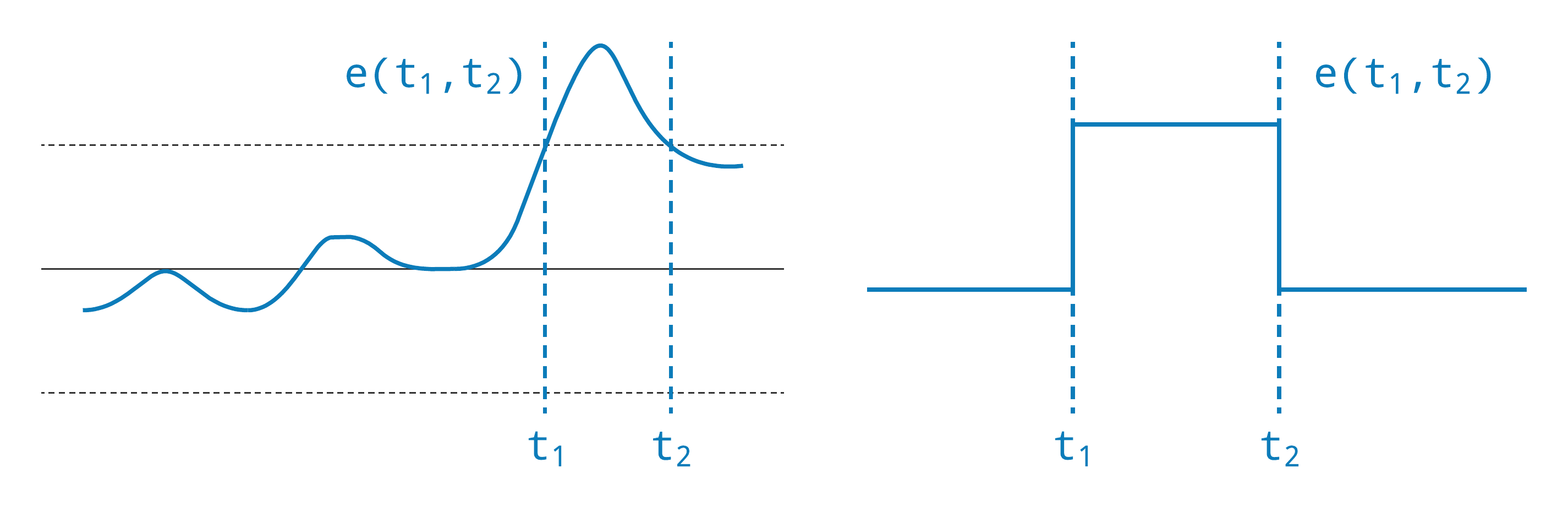 Finally, we are often interested not just in a single point in time, but rather a time-frame: an event with a start-time and an end-time. Time-frames might be predetermined and at regular intervals, like an hour, or a day, or a shift; or they may be dynamic and irregular, like a control-variable excursion, a battery discharge, or a set-point change. Many web applications support sharing context via time-frames through relative URLs that include the start-time and end-time, but time-frames need to be more integrated into the time-series platform than this. It is not just customer-facing applications that require this context—reports, calculations, or aggregations require the same context. We likely also want to attach metadata to the time-frame in the form of annotations or links. The time-frames themselves become a ubiquitous and first-class data-type of the system, providing context for the time-series data, and supporting queries like, what were all of the control variable excursions that started and ended within the past day?