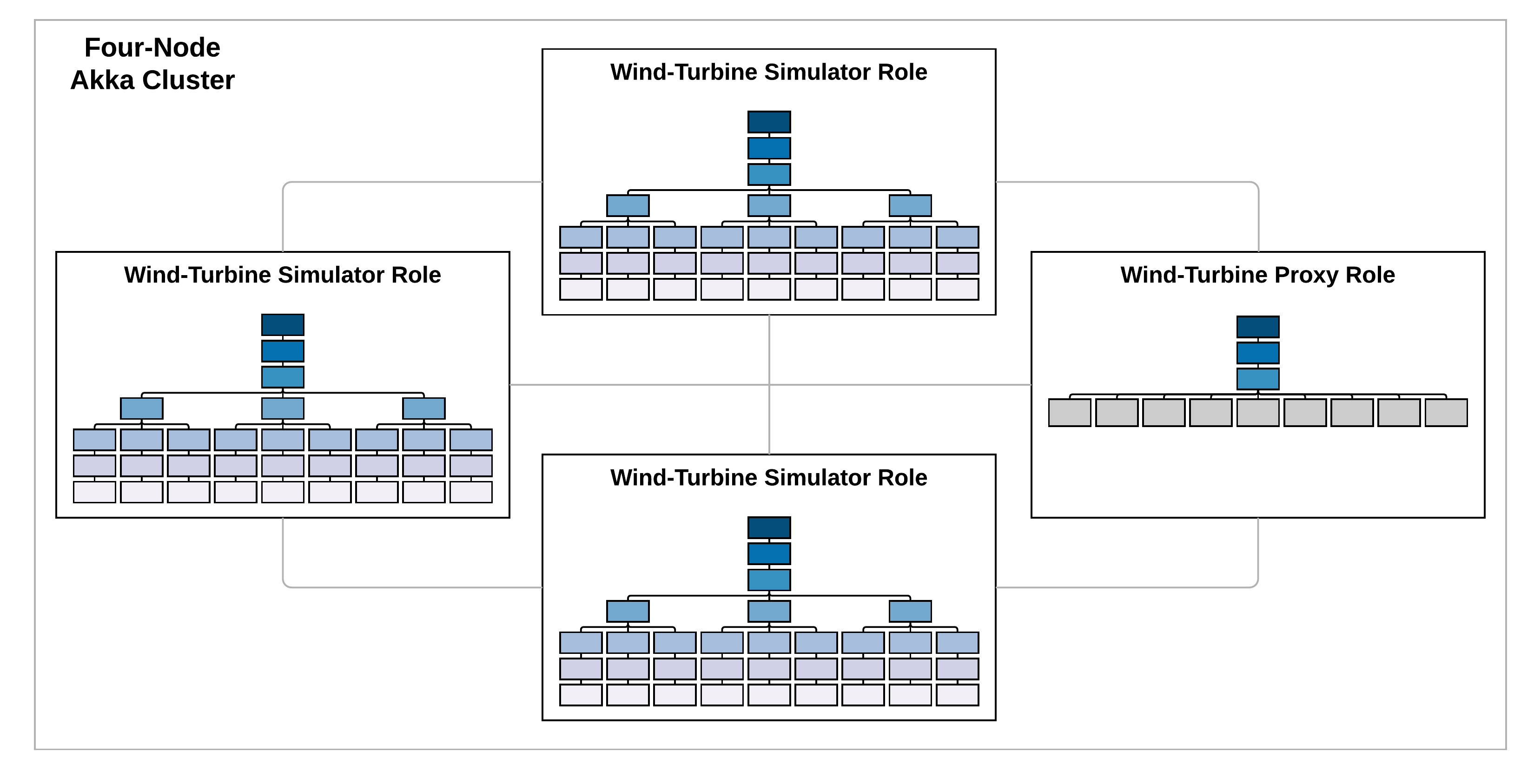In order to run all of the wind-turbine actors simulating the real-time telemetry, consider the following four-node Akka cluster. Three nodes in the cluster will assume the wind-turbine-simulator role and run the unique wind-turbine shard-regions, and wind-turbine-simulator actors, represented by the actor hierarchy presented previously. The fourth node in the cluster simply uses the shard-region proxy, represented by the actor hierarchy just presented, to start all of the wind-turbine-simulator actors.