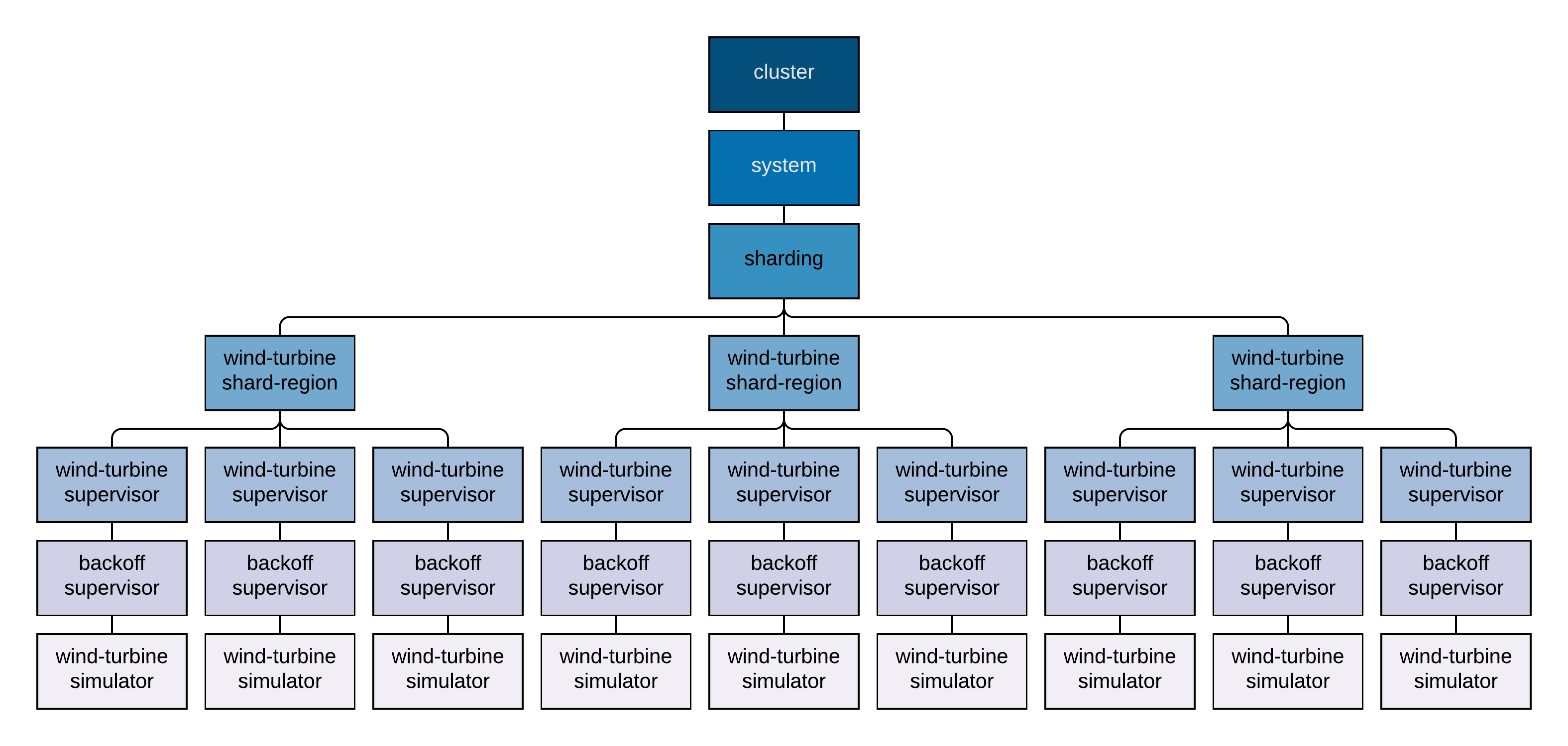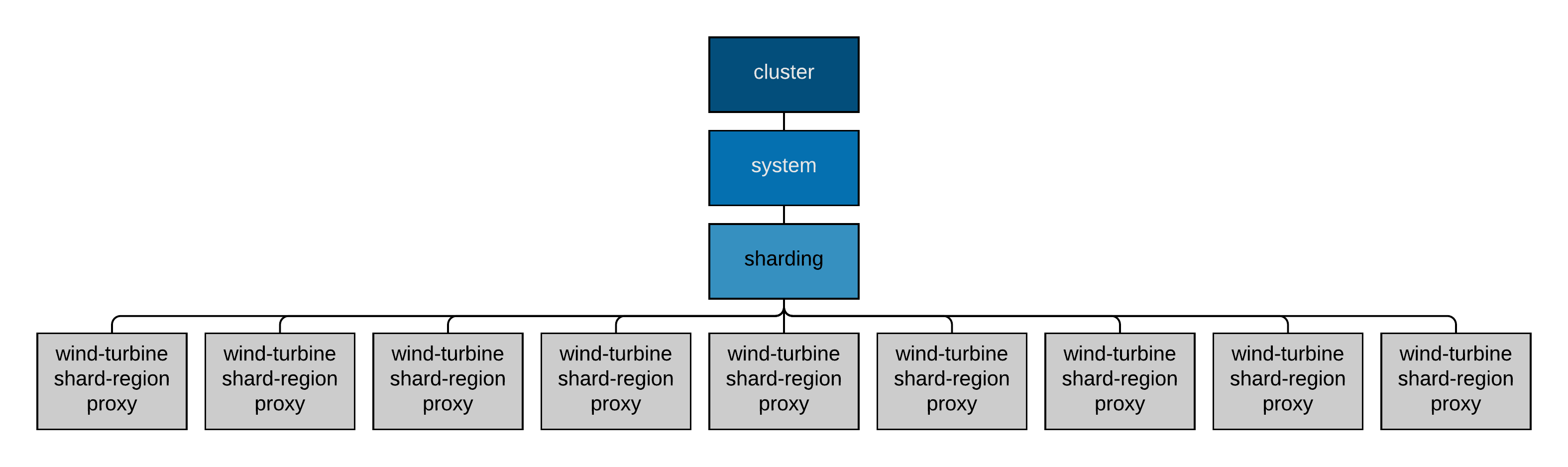 The Cluster Sharding proxy will not host any shard-region actors directly, rather, it will proxy messages to the associated wind-turbine-shard-region actor within the cluster, responsible for the shard. The actor supervision-hierarchy for the application that starts all of the wind-turbine simulators, through the Cluster Sharding proxy, is the following.