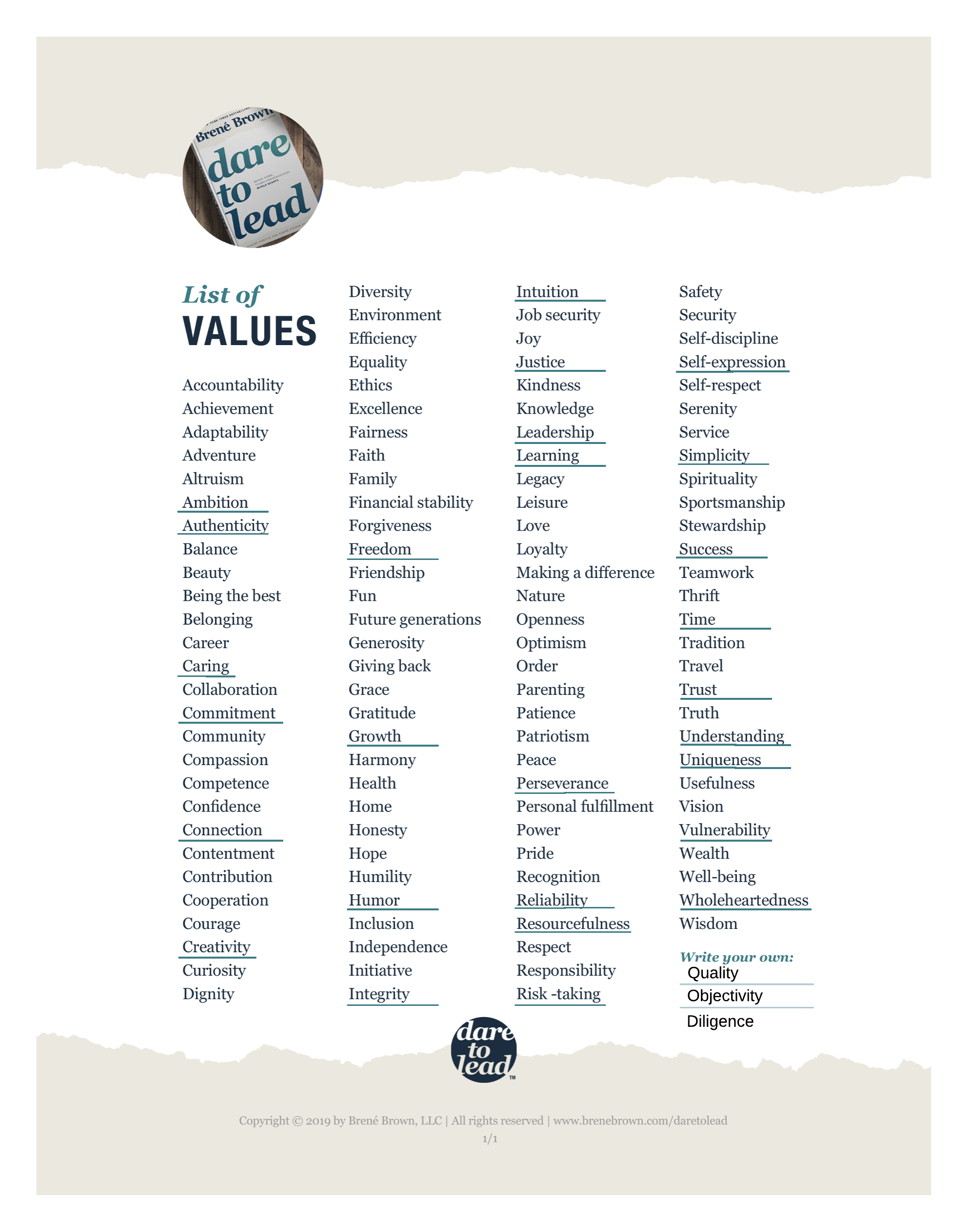 In Dare to Lead, Brené presents a list of values.[1] The list includes a diverse set of over 100 values, values like accountability, achievement, balance, competence, excellence, family, giving back, joy, legacy, order, patience, recognition, resourcefulness, travel, wealth, and wisdom. You can also add your own values. The exercise is to narrow this large list of values down to your two core values.