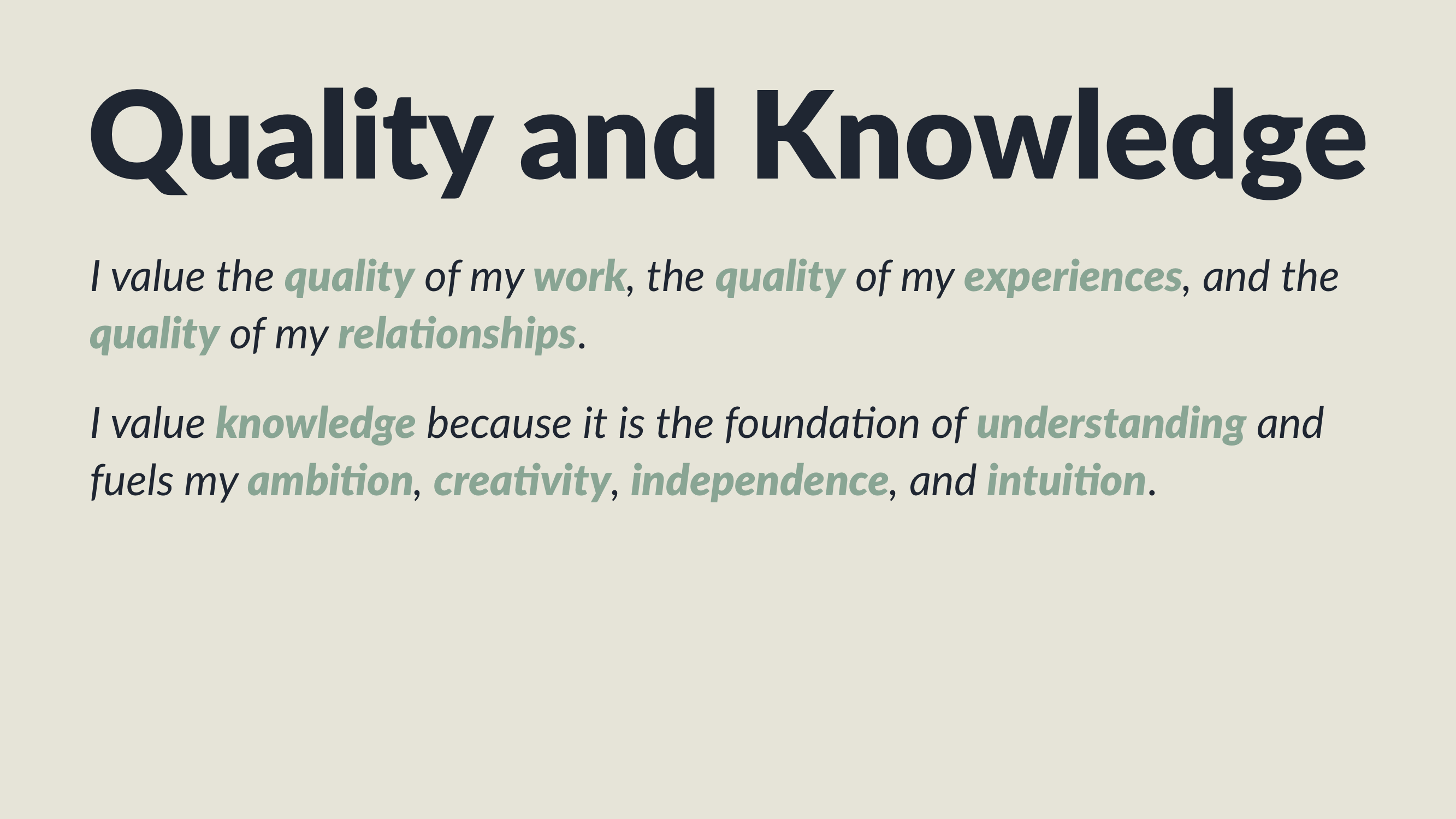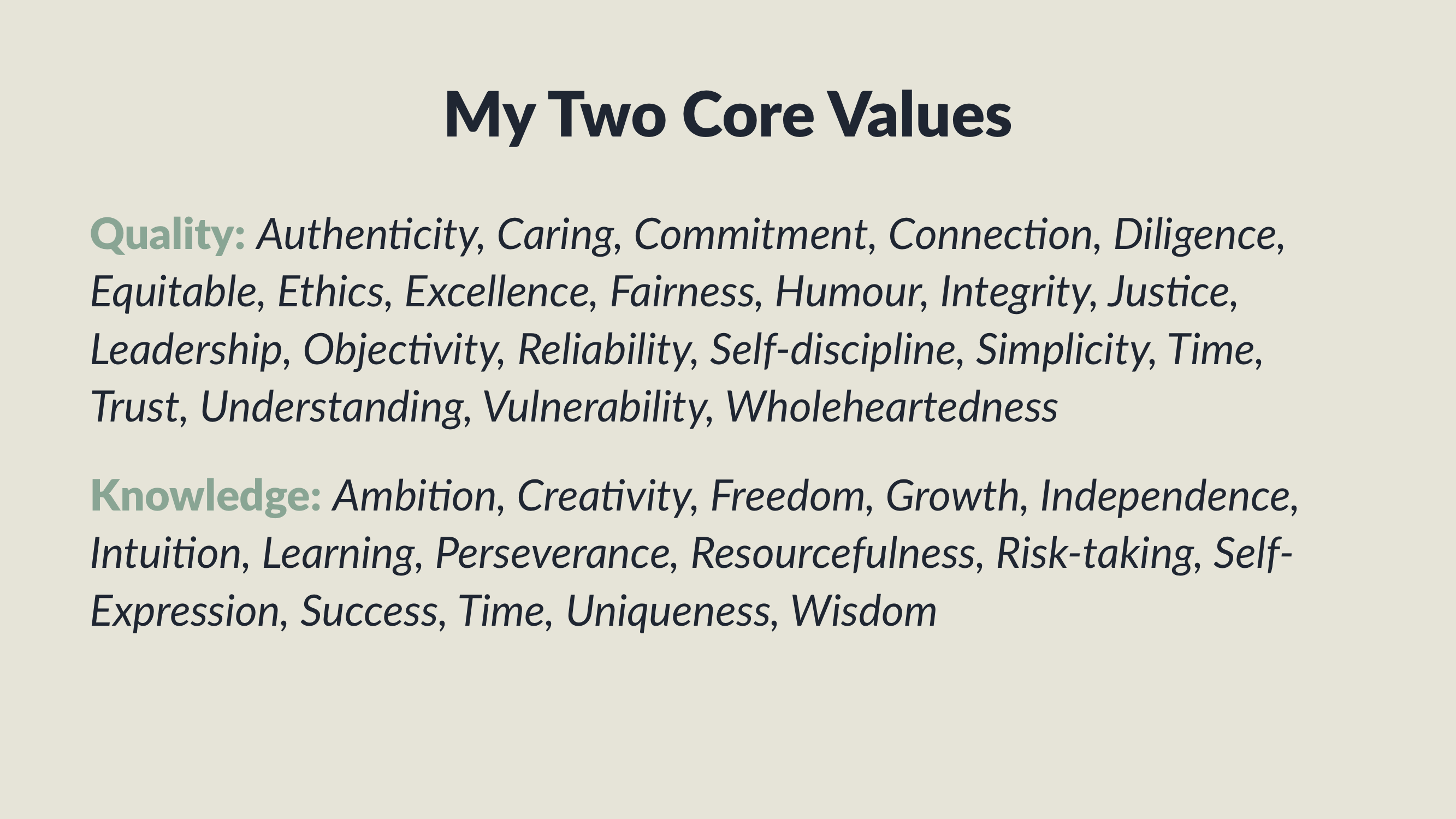 Once you have identified your two core values, form a sentence for each one that concisely communicates this value to another person. My two core values are quality and knowledge. I value the quality of my work, the quality of my experiences, and the quality of my relationships. I value knowledge because it is the foundation of understanding and fuels my ambition, creativity, independence, and intuition.