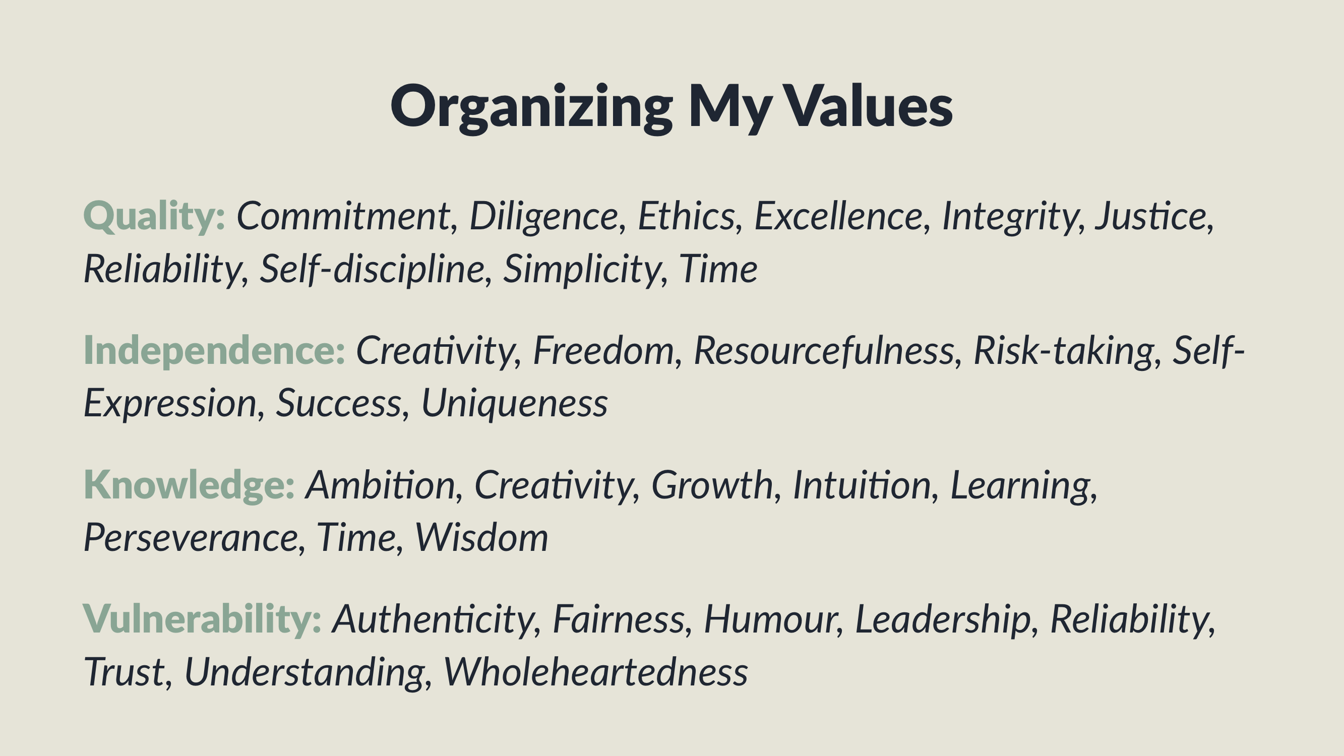 Note how connecting values with other values helps give them more texture and makes them easier for others to interpret. Some values I identified with in multiple ways. For example, time in terms of the quality of my time and my experiences, but also as the time to learn and expand my knowledge. Understanding I identified with knowledge, but also with vulnerability, in terms of feeling understood by others.